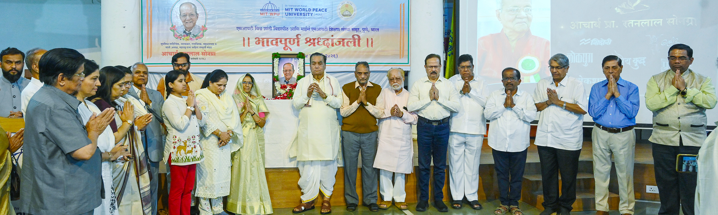 एमआयटी वर्ल्ड पीस युनिव्हर्सिटी व माईर्स एमआयटी शिक्षण संस्था, समूहातर्फे कोथरुड येथील डब्ल्यूपीयूच्या ज्ञानेश्वर हॉलमध्ये आचार्य प्रा. रतनलाल सोनग्रा यांना भावपूर्ण श्रध्दांजली वाहिण्यात आली.